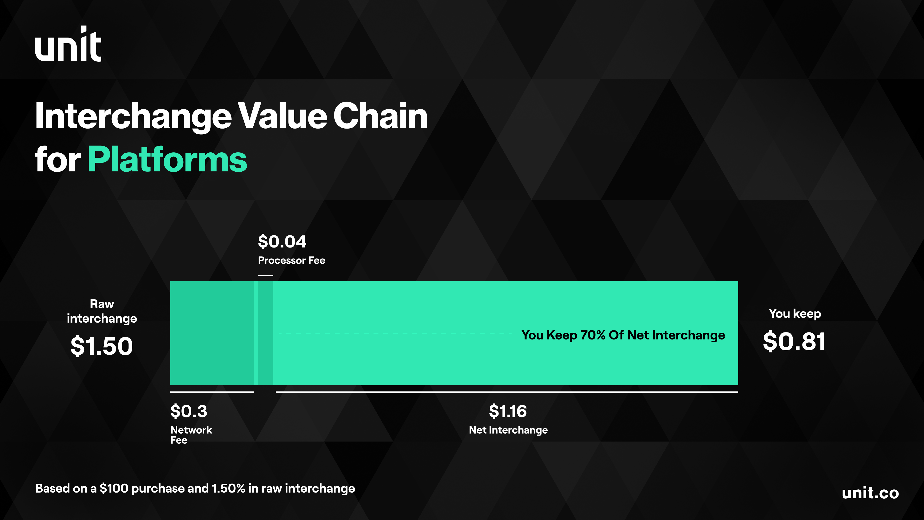 Unit’s model – just like that of other banking-as-a-service providers – is designed to pay you your share of interchange while passing through network and processor fees.