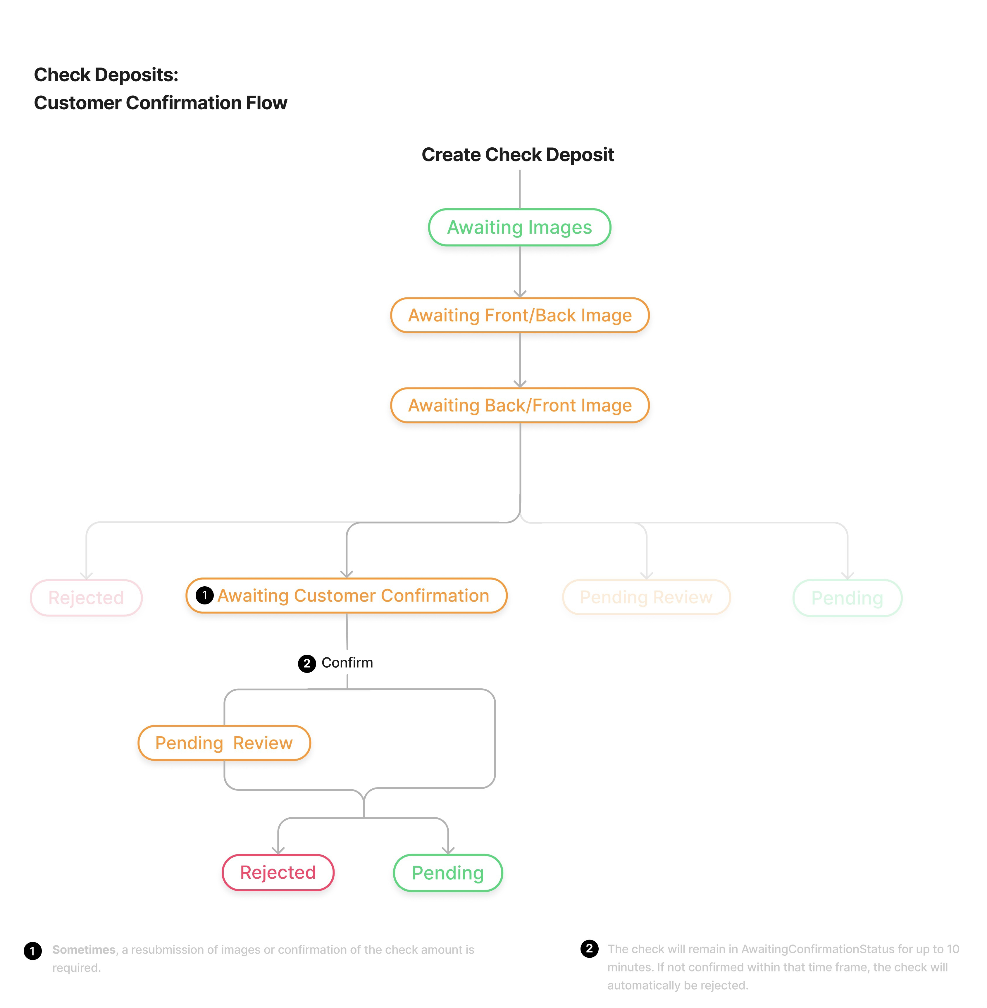 awaitingCustomerConfirmation | The attention of the customer is required. The customer should be prompt to retake images or confirm or amend one of the input fields. See Awaiting Customer Confirmation Reasons. Once update is submitted, confirm the check deposit. Check will go into one of the other 3 statuses |