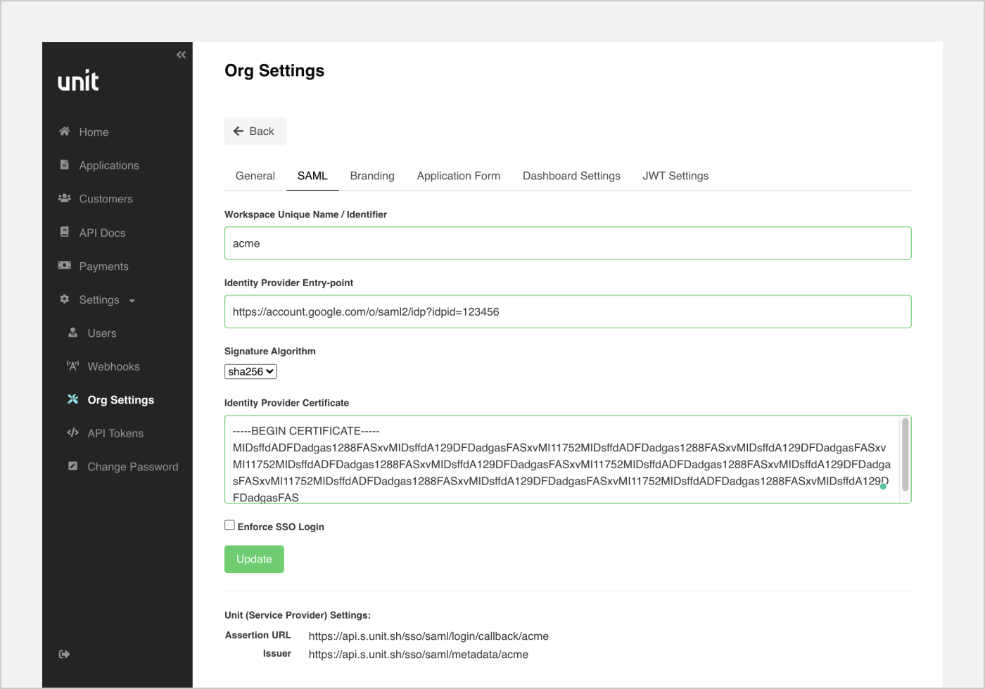- Edit Service provider details with the required URLs from the Unit dashboard/Org Settings>SAML: