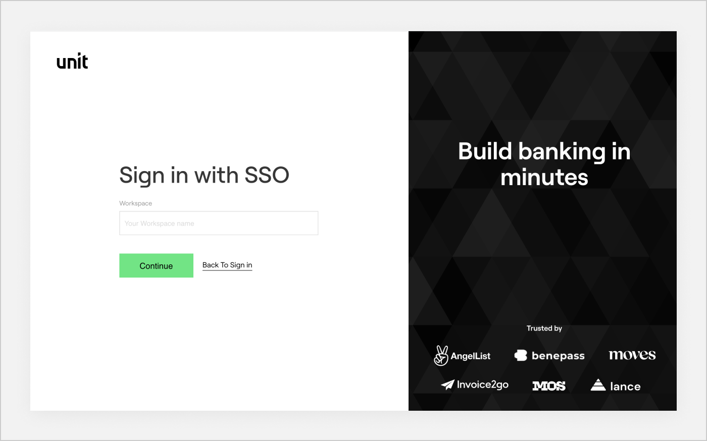 Single sign-on allows you to log in using your company credentials. Unit single sign-on (SSO) is based on SAML 2.0. Unit works with Okta as well as other enterprise identity management platforms such as Google Workspace, Microsoft Active Directory, and many others.