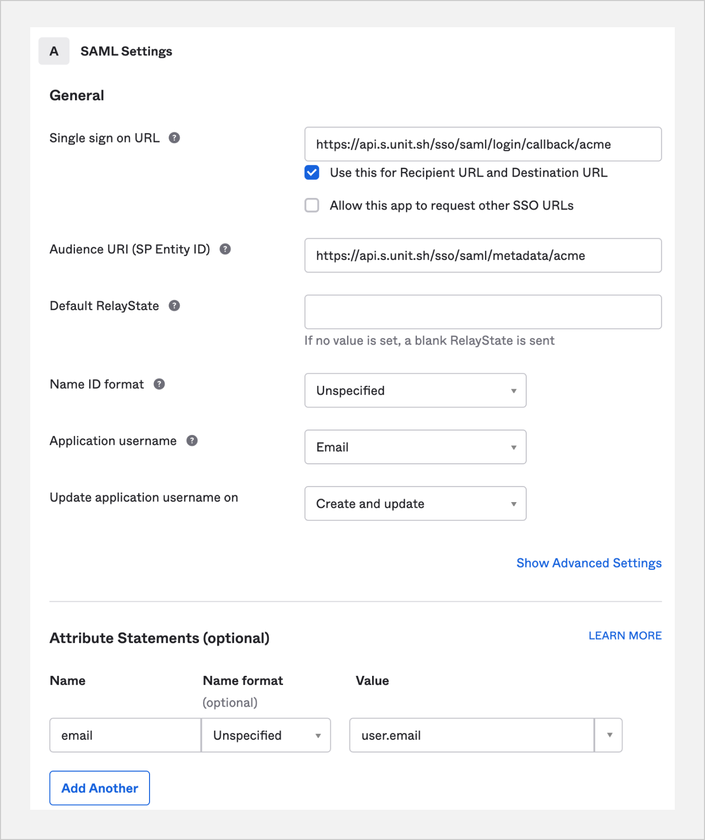 A connection can be made between Okta (the identity provider) and Unit (the service provider), to allow users to connect to their Unit accounts.