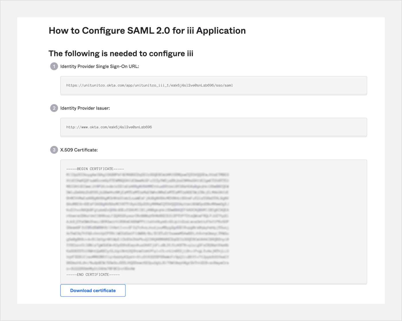 - Identity Provider Certificate: A certificate generated by identity provider for the specified SAML settings.