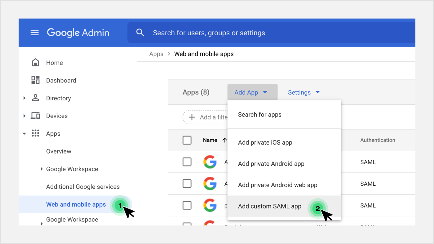 - Select the Web and mobile apps from Google Admin / Apps tab and then Add custom SAML app.